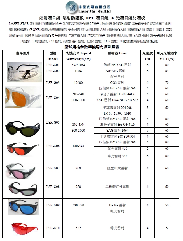 LASER STAR系列雷射護目鏡可全方位防護特定波段的鐳射和強光,防止鐳射對眼睛的傷害、其光學安全性能完全滿足《鐳射護目鏡鏡標準》、《ROHS標準》。佩戴舒適美觀、安全可靠、經久耐用。適用人群:鐳射操作人員、電腦操作人員、駕駛員、氣焊工、電焊工、高溫爐操作人員、醫務或工業人員操作X-光透視時、色盲色弱人員、所有受到強光、紫外線照射人員。適用於紫外鐳射、准分子鐳射、釹玻璃鐳射、半導體鐳射、CO鐳射、摻釹石榴石鐳射、紅寶石鐳射、CO2鐳射、砷化鎵鐳射等多種鐳射的防護。
